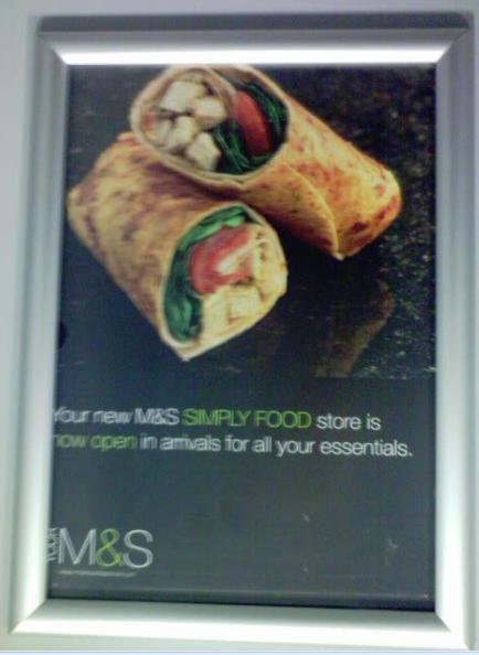 This was spotted on the inside of a toilet door in the mens loos at Luton Airport! Apart from the scatological associations of the image, we do wonder about the positive brand association of this approach. tttt= do you trust the experts to get it right (in this case marketing professionals)? What would a better way for M&S to use this space have been?