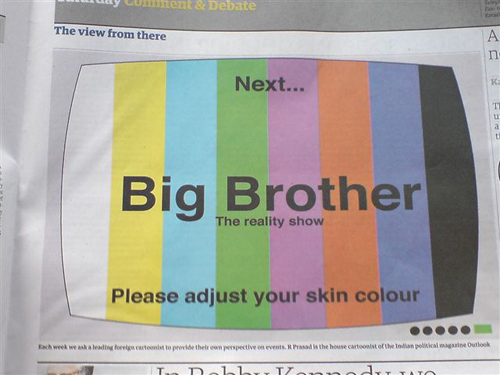 This is from a satirist in India - from the Guardian. tttt = where are you on Big Brother? One of the defining moments of British history and our relationship with class and ethnicity - or merely an irrelevant high-jacking of 'proper news'?