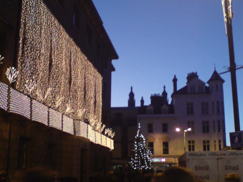 Dusk at Cambridge Guildhall - with a tree, and the top of Kings College Chapel. Thing to think through(tttt): how do fashions emerge....why the interest in simple, small white lights at Christmas?